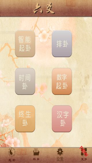大师六爻app是一款利根据我国古典精华六爻八卦来预测命途的算命手机软件。大师六爻app功能强大,按六爻卜卦,分为智能起卦,排卦,时间卦,数字起卦,终身卦,汉字卦等多项起卦,测算精准。喜欢的六爻卜卦的朋友快来下载大师六爻吧!六爻八卦是什么?六爻八卦预测,是古人观察大自然运行规律总结出来的一项法则。起源于西汉京房的纳甲体系。起初是用55根蓍草,到宋朝时才有了“以钱代蓍”。预测人将三枚铜钱放于手中,双手紧扣,思其所测之事,让所测信息融贯于铜钱之中,合掌摇晃后放入卦盘中,掷六次而成卦。配以卦爻,及动变以后。结合易经的爻辞,以及测卦当天的年月日的干支,而判断事物的发展过程和结果。六爻是民间流传最广的预测方法之一,其变化有梅花易数,观音神课,以及文王六十四卦的断法。相对于正宗的六爻断法又要简单许多。