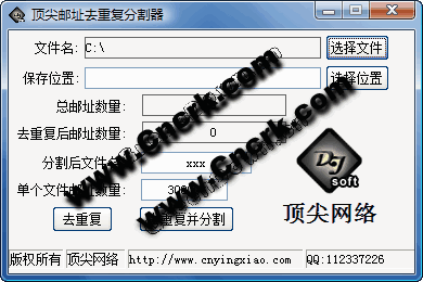 顶尖邮址去重复分割器 V1.0 简体中文绿色免费版 顶尖邮址去重复分割器是一款邮址去重复分割软件。许多大的邮址群发的时候不方便处理。此软件可以将你的邮址文件以最快的速度去除其中重复的邮址,并且可以把非常大的邮址文件分割成比如每个文件包含5万个邮址的小文件,方便处理,提高效率。处理几百万邮址的文件不到1分钟。本软件没有任何功能限制,完全免费。软件为绿色版,无需安装,解压即可