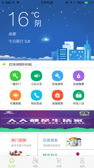 生活家app如果业主在小区里发现有什么东西坏了他只需要拍个照,通过APP上传,物业可以派人去维修。生活家app拍照报修、在线投诉、在线缴费、一键开门、小区公告等功能基础上,根据业主日常需求,整合小区周边商业资源,新增房屋租售、社区商城、社区交互、圈子、我的邮包、游戏功能、积分等消费功能,打造社区生活服务O2O平台,为业主提供最为快捷方便的服务。同时上线的还包括商家APP、员工APP。