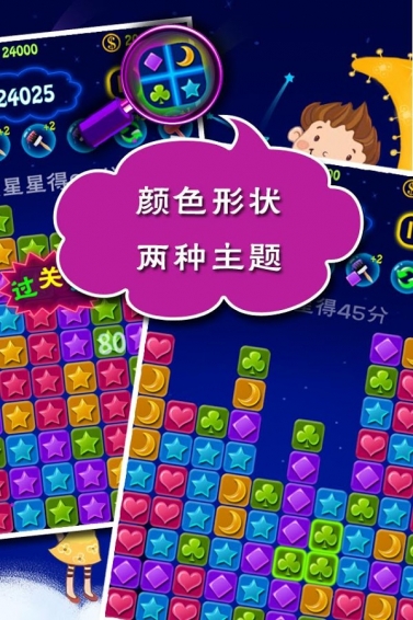 满天星? -史上最流行的星星消除游戏,现在正式发布第2版。新版更精彩,不容错过!经典的游戏玩法,三种不同的演绎。无论是闯关模式,限时模式,还是步数模式,总有一种适合您的兴趣; 形状和颜色,两种不同的主题,色觉欠佳者可以选用形状主题,总有一个主题能入您的法眼;