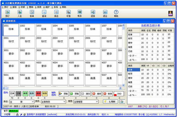 按楼层列出客房号,动态实时地显示客房状态,可显示出房间图片;可直接在房态表选择显示常见的房间列表、全部客房;全部清洁房及不同房类房间状态、客房图表。可直接在房态表上进行房间登记、退房、拖拉换房、账务处理、客人资料修改、押金及延住,实现快速的客与房管理。客人留言、客人换房日志查看。迷你吧的消费登记。今日抵店、今日离店、客房清扫及关联房等标志一目了然。