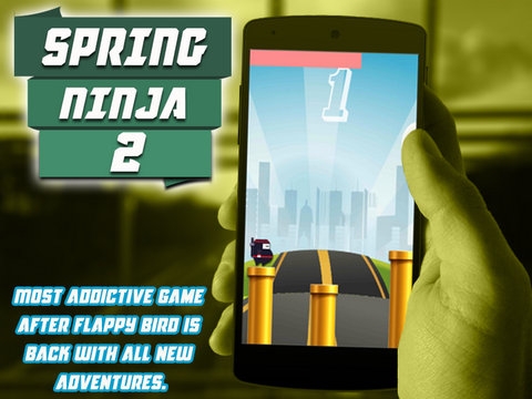 休闲小游戏《忍者弹弹弹2SpringNinja2》,游戏主角是一名有着啤酒肚的忍者,玩家长按屏幕,控制忍者脚下弹簧的松紧度,然后把忍者被弹飞到前面的悬崖上。