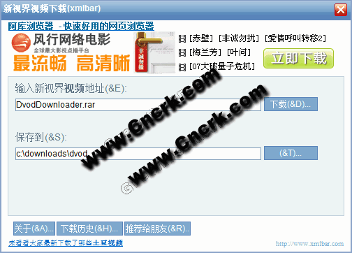 新视界视频下载(xmlbar)是一个专门用于下载新视界视频到本机硬盘上的小软件。它不但完全免费而且不含有任何插件,可以完全干净卸载。用户只需输入需要下载的新视界视频的观看页面地址并按下下载按钮,或者更方便的使用拖放方法将页面地址从浏览器地址栏拖到本软件的浮动窗口,它就会自动识别后进行下载,下载的文件格式为flv。更好的是它还支持多个新视界视频文件同时下载,并能显示出真实的新视界视频文件的下载地址,下载完后您还可以选择马上播放,而且它还有查看管理下载历史记录的功