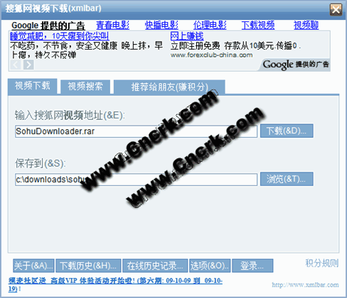 搜狐网视频下载(xmlbar)是一个专门用于下载搜狐网视频到本机硬盘上的小软件。它不但完全免费而且不含有任何插件,可以完全干净卸载。用户只需输入需要下载的搜狐网视频的观看页面地址并按下下载按钮,它就会自动识别后进行下载,或者更方便的使用拖放方法将页面地址从浏览器地址栏拖到本软件的浮动窗口,它就会自动识别后进行下载,下载的文件格式为flv。更好的是它还支持多个搜狐网视频文件同时下载,并能显示出真实的搜狐网视频文件的下载地址,下载完后您还可以选择马上播放,而且它还有查看管理下载历史记录和视频搜索的功能