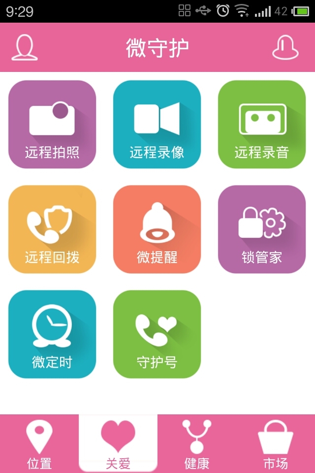 微守护(WECARE)是酷达通讯基于“关爱和守护”的理念,结合当下社会亲情关爱日趋淡化的大背景下为家庭量身打造的智能化应用云平台,它主要由微守护智能终端(儿童机,老人机,智能穿戴设备,智能家居设备等)、微守护客户端、微守护功能网站和微守护智能云平台所构成。为家人的安全和健康提供包括位置查询、环境安全、健康关爱、学习娱乐等综合软件应用服务。【软件特点】