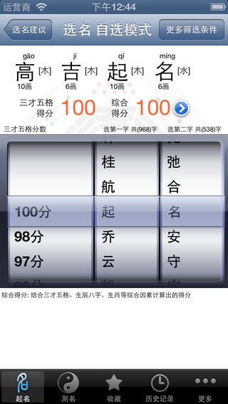 *自选模式下,提供完全的筛选功能,可指定汉字五行属性来匹配喜用神,也可指定用字,比如满足家族族谱指定用字的需要,也可排除你不喜欢的一些汉字,同时提供生肖喜忌的用字选择