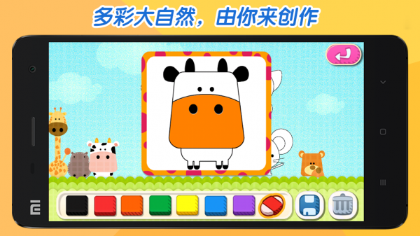 游戏针对婴幼儿设计,符合其对绘画的基本需求。熊孩子爱涂鸦突破传统涂鸦应用的束缚,不仅包含传统的涂鸦模式,并且针对孩子的正常认知精心设计了艺术填色部分,针对孩子所喜闻乐见的一些事物进行创造性的艺术填色,同时还可以对孩子的作品进行保存让我们共同为孩子留下童年美好的记忆。后续我们更规划多种多样的填色更新——花鸟鱼虫,天文地理,让孩子在欢乐的涂鸦中学到更多的知识。【游戏特点】