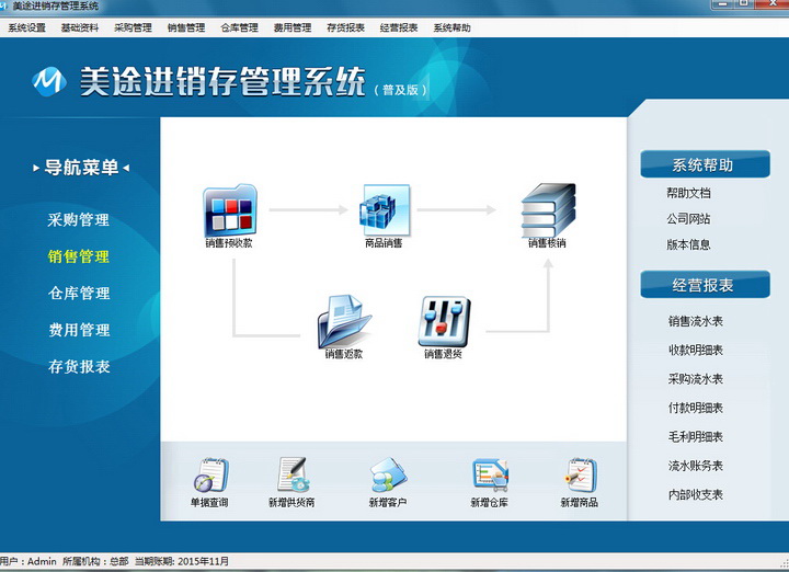 美途进销存管理软件—普及版是美途软件科技有限公司针对中小企业推出的集采购、销售、仓库、费用、报表与分析为一体的企业管理软件。普及版具有"操作方便,价格实惠"的特点。系统支持多机构、多仓库多用户同时操作,数据实时同步,支持严密的多种授权机制,保证企业信息安全。一套软件支持多账套、跨地域、多门店、分仓库管理。让企业以最低的软件支出成本、实现最优的企业信息化管理。【软件特点】