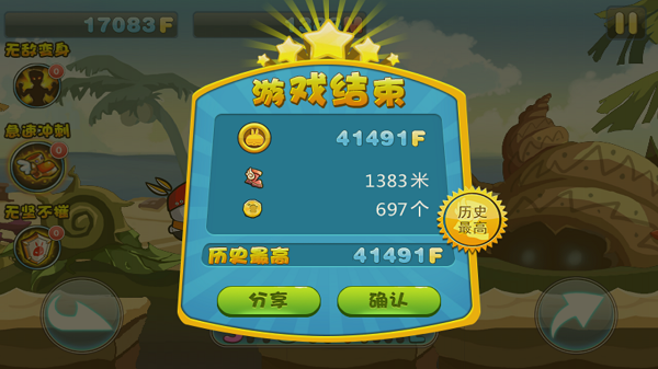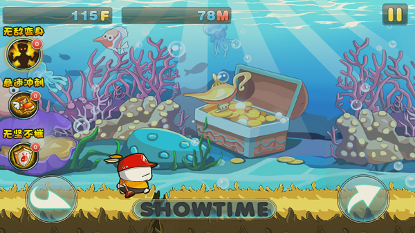 游戏操作也是简单到不能再简单了,玩法跟传统的跑酷没有太大的差别,大家只需通过点击虚拟按键,便可控制流氓兔做向上跳跃或者下滑的动作,从而来吃到沿路不断出现的道具和金币,及躲避各种层出不穷的障碍,流畅的操控手感,主要考验的还是大家敏捷的反应能力。