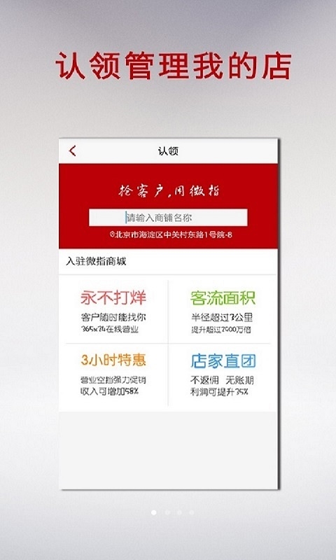 微指商户版是一款专业服务于实体商户的销售平台软件,让商户随时随地的做生意。店铺位置不够好?——微指帮你将实体店搬上手机,移动互联网帮你打破空间障碍!