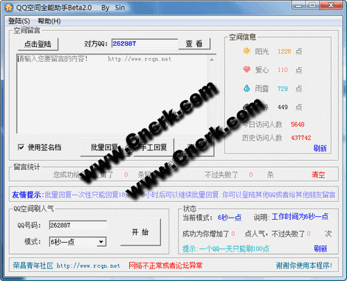 主要功能: 1.批量刷留言。 2.刷人气 3.有4种刷人气模式 4.快速查看QQ空间信息 5.一个QQ限制1天只能刷100点