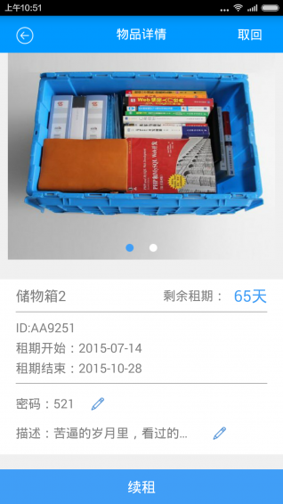 听起来很高大上吧,其实“储物乐”就是通过App下单,我们服务人员上门送储物箱,你可以把暂时不用的物品(换季衣服、小孩玩具、前任物品、看过书籍之类)放在储物箱里,交给我们存储。
