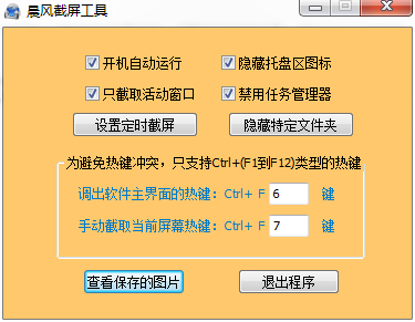 第四步:设置调出软件主界面的热键,默认是同时按下Ctrl和F6键,则会调出软件主界面,你也可以通过输入别的数字来修改此热键。如果同时按下Ctrl和F7键,不管之前有没有设置定时截屏参数,都会手动截屏一次。同样你也可以修改此默认热键。如果你要查看截屏之后自动保存的图片,可以点主界面上的“查看保存的图片”按钮,软件会自动打开图片文件夹(即使你之前设置了隐藏此文件夹)。
