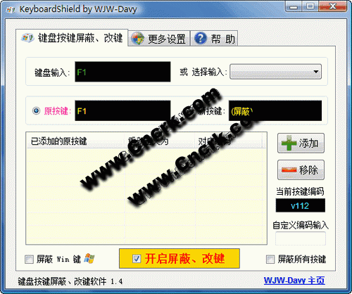 键盘按键屏蔽改键是实用的键盘改键屏蔽工具,可以屏蔽键盘 按键(单一按键、组合按键皆可屏蔽),也可以将某一按键(或组合按键)重新定义为其他新的按键(可以将一个单一按键,重新定义成多个按键的组合按键,反之亦然)。