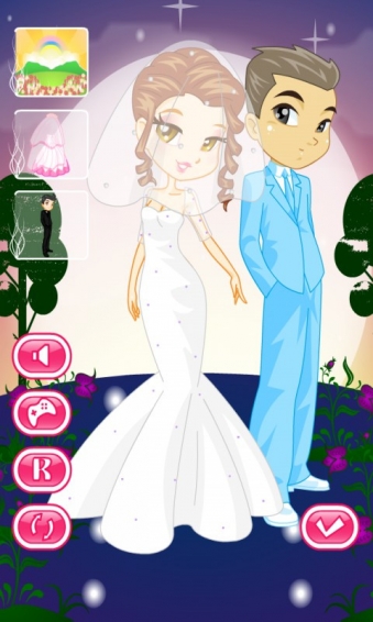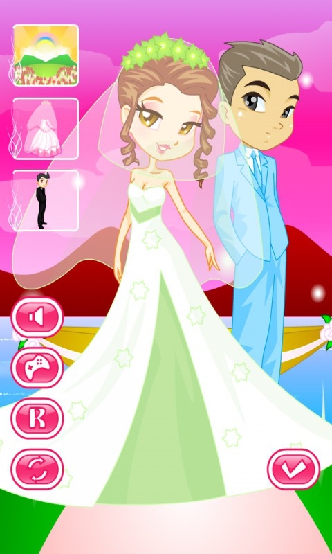 酷酷新娘换装沙龙是一个换装类游戏。点击衣服图标的按钮可以直接切换衣服,其他的按钮可以切换其他的道具;“R”代表重置,让装扮回到开始的样子;旋转的箭头是“随机”,按了之后角色随机穿一套衣服和饰品;“勾勾”是展示你打扮好的角色,按下之后会隐藏掉其他的按钮;喇叭按钮可以关掉音乐。 婚礼的钟声响了!仪式即将开始!唯一剩下的就是选择一个耀眼的童话般的裙子!但她似乎无法决定。那你还等什么?去帮助她!