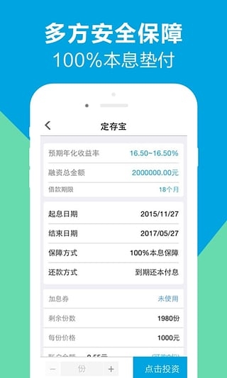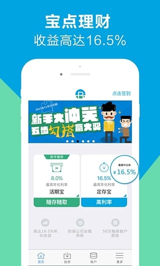 宝点理财app是一款理财投资平台,16.5%年化利率,50元即可投资,本息全额保障,绝对是高收益的p2p网贷投资理财神器。