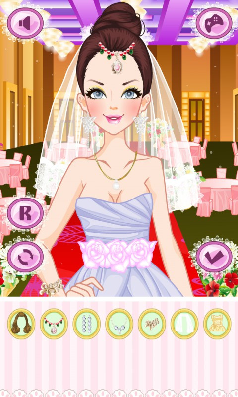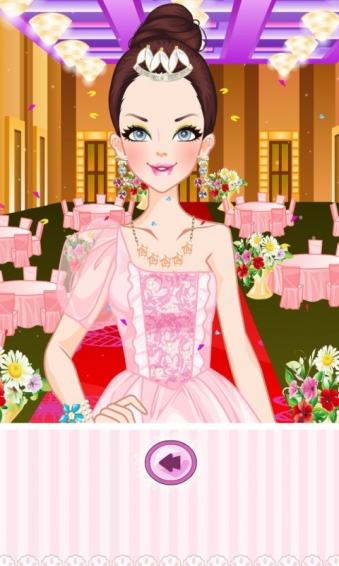 时尚新娘换装记录是一个换装类游戏。点击衣服图标的按钮可以直接切换衣服,其他的按钮可以切换其他的道具;“R”代表重置,让装扮回到开始的样子;旋转的箭头是“随机”,按了之后角色随机穿一套衣服和饰品;“勾勾”是展示你打扮好的角色,按下之后会隐藏掉其他的按钮;喇叭按钮可以关掉音乐。 公主今天将和她的白马王子结婚。这将是最大的皇家婚礼。一切都安排好了,婚礼将在城堡举行。
