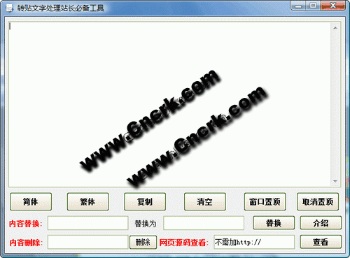 转帖文字处理站长必备工具 V1.0.0 简体中文绿色免费版 现在很站长都开始重视网站内容原创性的问题了,但是原创内容要怎么找呢?那就需要借助一些小程序了,该工具支持简体-繁体互转功能,支持指定文章内容关键词的替换与删除,支持指定网页源代码查看功能,由于同类工具基本都是在线工具,所以处理与执行速度远远不及本地软件的速度快,并且为你省去了输网址的麻烦
