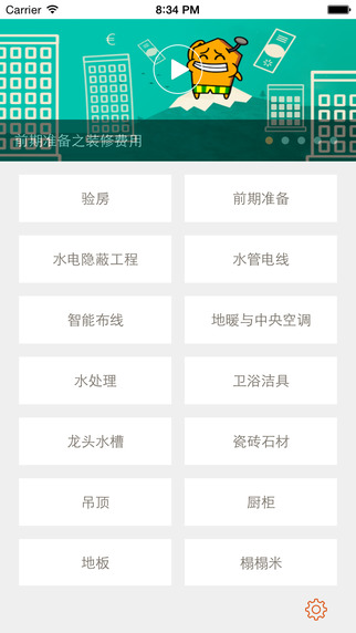 目前有的课程分类有:验房,前期准备,水电隐蔽工程,水管电线,智能布线,地暖与中央空调,水处理,卫浴洁具,龙头水槽,瓷砖石材,吊顶,厨柜,地板,榻榻米,楼梯,板材与木器漆,门,窗,阳光房,开关,灯具,墙纸,窗帘,地毯,家具,沙发,床垫,乳胶漆等。