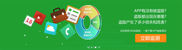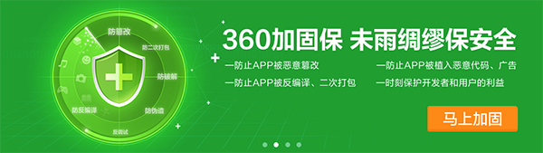 360加固保是为移动应用安全提供专业保护的平台,致力保护应用安全和开发者利益。360加固保为开发者的应用提供免费安全加固服务,独创了多重防护方式,对应用程序深度加密处理;独有的程序文字信息加密功能,能有效防止应用被反编译和恶意篡改,保护应用不被二次打包,保护数据信息不会被黑客窃取。