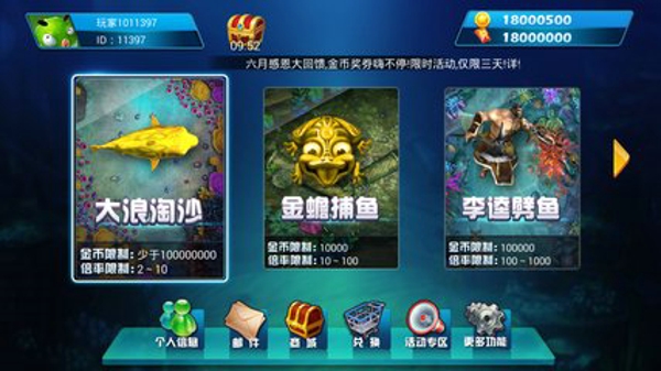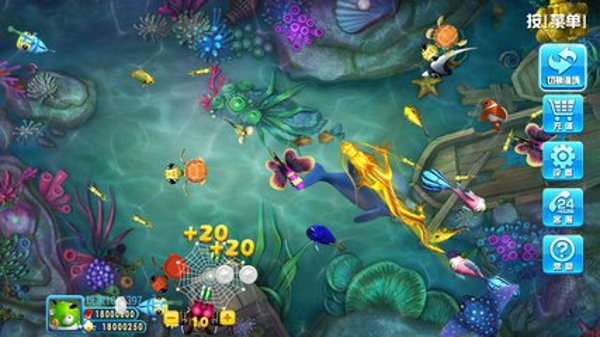 《金蟾捕鱼2》是根据当今流行的街机捕鱼经过自主研发改良而成的休闲类游戏。游戏沿袭了街机捕鱼中金蟾捕鱼,李逵劈鱼,大圣闹海等特色场景,在保留原始倍率玩法的基础上加入奖券的新颖玩法。玩家在游戏房间内通过消耗金币打渔,捕获海鱼后掉落金币,完成一个游戏的金币流循环。击杀场景Boss更有机会获得随机奖券,一定数量的奖券可以兑换成话费或实物哦。既能体验捕鱼游戏的乐趣,又有机会获得奖励,还等什么呢!快来捕鱼吧!