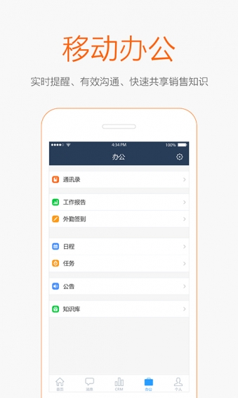 3、移动协同办公:即时沟通,有效安排、接受工作,日程任务及时提醒,重要工作绝不遗漏、知识库信息随时查询,帮助企业解决员工跨岗位学习问题,全面提升销售人员专业素质。
