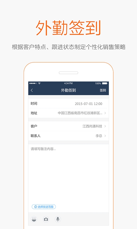4、外勤签到:创新性的电子地图签到功能,提供了轻松便捷的销售外勤人员管理,同时也方便企业对于外勤人员实行有效的管理办法。
