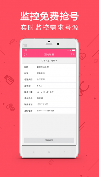 3.一键抢号,提交抢号单,准点提醒放号时间,无需选择输入,一键抢号,快人一步。