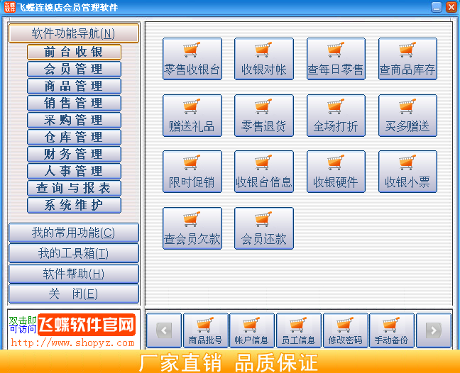 飞蝶连锁店会员管理软件是一款专门针对大中型连锁店而开发的会员管理软件,软件整合了收银、会员管理、商品(服务)管理、采购管理、仓库管理、财务管理、人事管理、查询与报表、系统维护、短信群发等功能,协助您轻松经营管理。