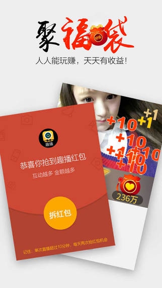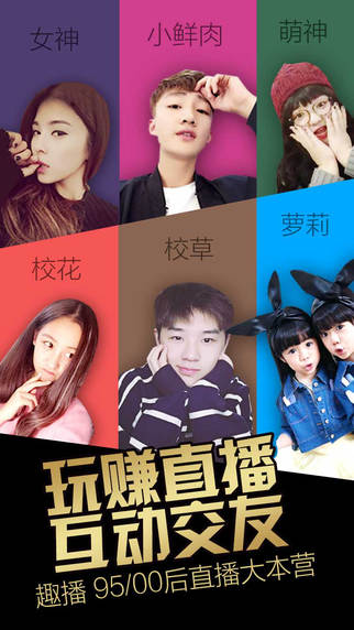 趣播-最活跃的95/00后手机直播大本营,直播界网红成长基地!开播无门槛,动态视频美颜,最高比例变现,主播返福利抽奖,好玩又好赚!远离成人世界,趣播是小青年自己的手机直播朋友圈,女神、萌系、小鲜肉、校花校草、搞笑逗比奇葩秀、动漫二次元、好嗓门好声音⋯⋯就是你的菜!【软件特点】