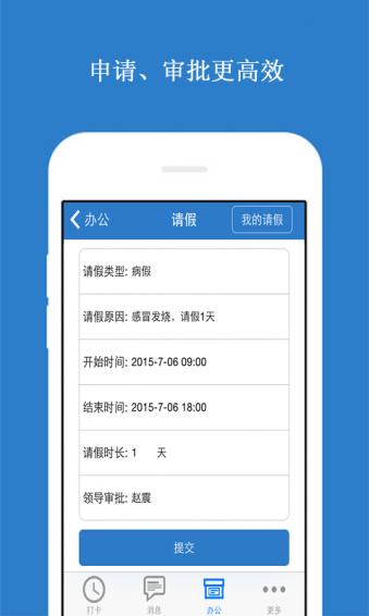 4.在线无纸化审批人员请假、费用报销、工作情况拍照反馈等,环保、节省办公费用;