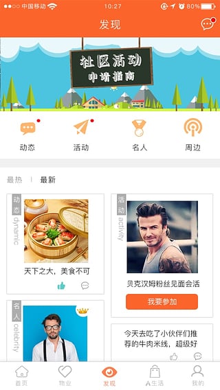 3、“发现”板块新增动态、名人等模块,可在线发布动态、申请社区活动,也可申请为名人,让更多业主发现您;