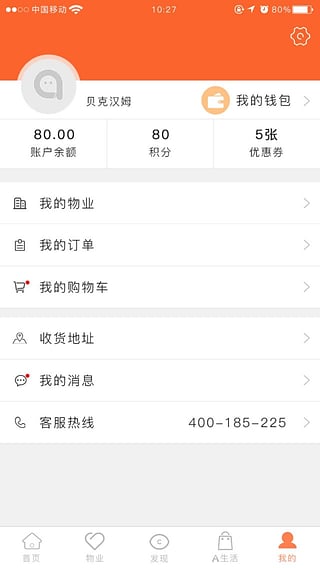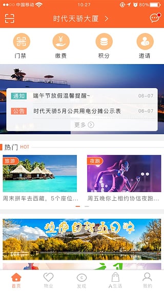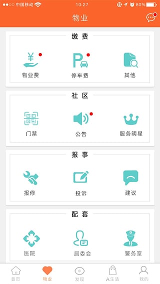 v2.0.41、页面架构更清晰,APP由“首页、物业、发现、A生活、我的”五个功能模块构成;