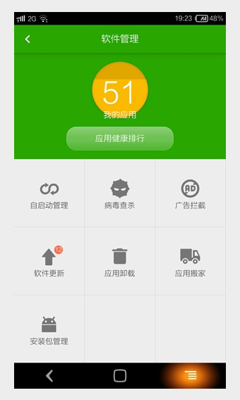 5.除了常规的省电管理、流量监控、软件管理、备份恢复这个功能外,酷管家还提供了病毒查杀功能,针对手机全盘软件进行扫描检测,杜绝一切手机病毒的入侵事件发生。