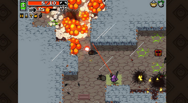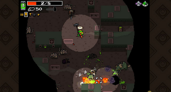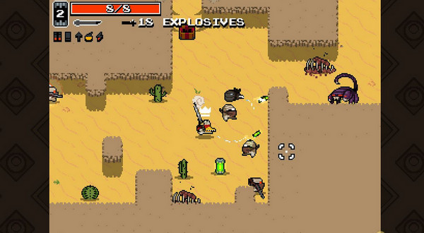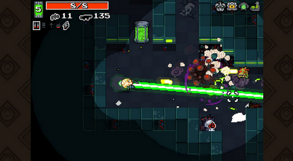 游戏主界面选择角色,目前有十个变异体可供选择,其中几个需要满足特定条件来解锁(到达新的场景或者杀掉100个敌人等)。不同的角色有着不同的基础属性和技能,比如小鸡chicken的属性就是很难被杀死,它的武器是武士刀,技能是减缓时间。每次游戏都是随机生成的场地,消灭变异体获取经验(绿色晶体)和补给(弹药或者血瓶),升级后会在下一关开始前让玩家选择一个方向强化角色,可以强化的有血量、武器威力等等。角色可以同时装备两个武器,枪械类武器的子弹数量是有限的,子弹打完了就切换副武器吧。场景中红色宝箱可以开出武器,包括锤子、刀、镭射枪等等。