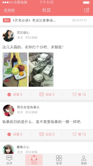 1、考前点评,平台上你可以找到目标院校老师,提交自己的作品让老师有目的、有针对性的为你点评。2、互动社区,跟全国各地的学霸们一起分享艺考路上的点点滴滴。