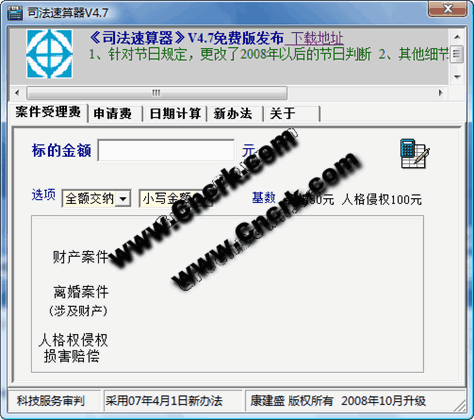 《司法速算器》专业的诉讼费计算软件,是作者原创的审判辅助系统系列软件之一。 软件无需安装即可使用。(下载后的的一般是经rar压缩,需先解压缩) 在设计该软件时,已充分考虑的易用性。一般操作方法无需多言。 这里说一下第四版新增的离婚案件和人格权侵权案件的基数设定功能的使用方法。初次使用,默认的基数为“”离婚50人格权100“”,将鼠标移至这排文字处,点击鼠标左键,会弹出设定窗口。按照《诉讼费用交纳办法》的规定,离婚案件基数范围为50-300,人格权侵权的为100-500。各地法院可按照当地的统一规定设定起算基数。点击确定“”修改按钮“”即可。下次使用就无需再设定。 需要说明的是,在使用该设定功能使用到注册表,用于存储上述计算基数。有些注册表监控程序会提示注册表的修改,选确认修改,方可设定成功。 对于公告开庭日的计算,是用于计算公告案件的开庭日的。在计算时,是从公告日的第二日起开始计算的。 计算结果会自动判断是否系节假日,可自动判断星期六和星期日,将5月1日至7日,10月1日至7日作为节假日。对春节期间未作判断,同时,因在五一、十一、春节节日安排时,前后的星期六、星期日存在不可确定的调整(星期六、星期日也可能上班),故星期六、星期日是否放假并不确定。因此,软件的节假日提醒顺延开庭日的显示仅供参考,并非绝对。