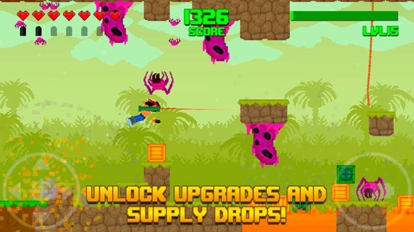 本作的操作比较简单,只需要一虚拟摇杆和按键,就可以控制角色移动和射击。从视频中可以看出,角色的动作看起来一点都不自然,看起来更像是一个被甩在空中的公仔一样,不过玩起来却也别有一番滋味。