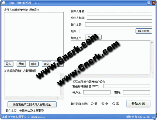 三合电子邮件群发器 V1.0 简体中文绿色特别版 使用方法:1、首先添加或导入收件人邮箱地址;2、填写或设定邮件的相关内容和各项参数;3、点击“开始发送”按钮即可自动发送。