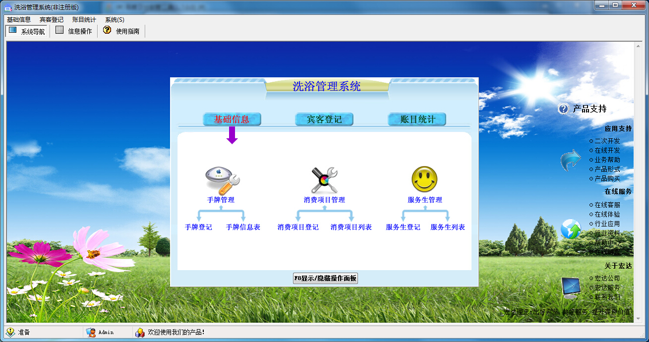 洗浴管理系统是一款由宏达软件打造的洗浴管理软件,这款软件界面简洁,操作简单,软件集基础信息、宾客登记、账目统计等功能于一体,可以让洗浴宾客消费的管理工作尽可能的简化。