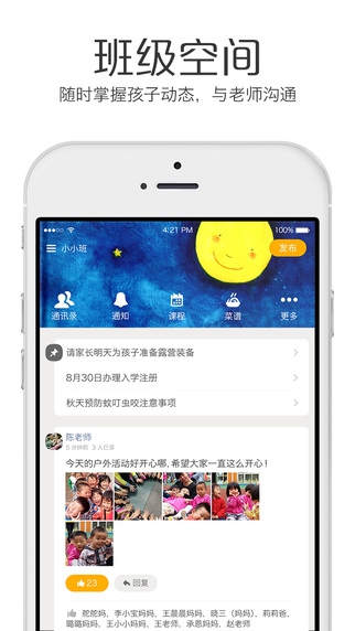 1.新增图文分享功能,可以将宝宝在班级内的图片或动态以图片的形式分享到朋友圈等社交软件,分享宝宝的日常给亲朋好友,让你晒得更有档次;
