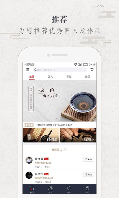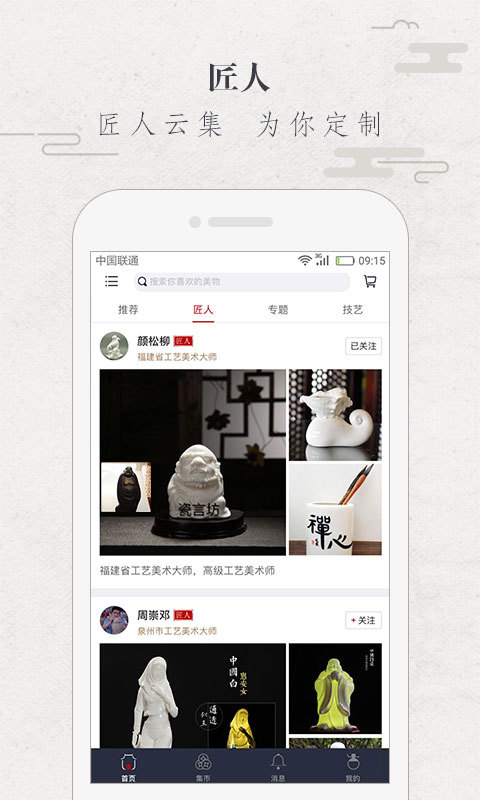 ---匠人可在平台上开店销售与分享自己的作品,同时结合了新的互联网玩法来展示、传播、出售自己的作品。华夏匠人APP让匠人和作品被看见,让匠人的声音被听见。匠人的作品在平台通过申请资历认证及知识产权认证将能得到有效的知识产权保护。---手工艺品爱好者可在平台上浏览、购买、定制心仪的匠人作品,欣赏古典文化艺术的非凡魅力、交流匠人文化。还能与平台匠人进行直接的沟通交流,更好的了解与学习民间手工艺品文化体系。