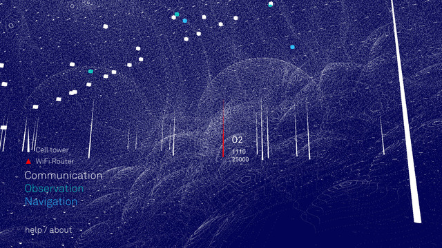 这款AR APP应用程序提供了一个增强现实体验,可以看到由iPhone或iPad或各种电子设备发出的无线信号包围,就像看到以前看不见的一个新世界:来自无线路由器和远处发射塔前面的球面波,你可能会发现一颗卫星经过头顶。应用逆转的日常经验“通过我们的设备,隐藏可见的同时,还揭示了无形的技术景观”这样,就像透过你的平板来架窥视这个有点像矩阵的世界。该应用程序APP的这些来源和更多的功能,是通过几个公共数据库编译的。来自这些来源的波只是基于距离的估计,而不是由你的设备所采取的实际测量。这意味着,相比一个精确的工具,其可视化是一种能够分析你身边的电磁辐射的艺术经验,尽管如此还是很酷的好吗。