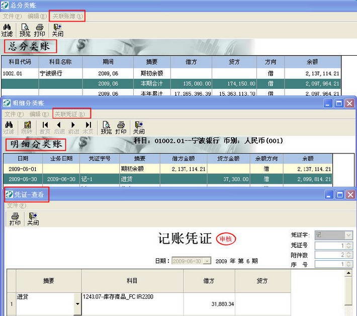 软件提供了完整的账证一体化查询功能,可以根据总账直接查到它所辖的明细分类账,再从明细分类账一直查到记账凭证。
