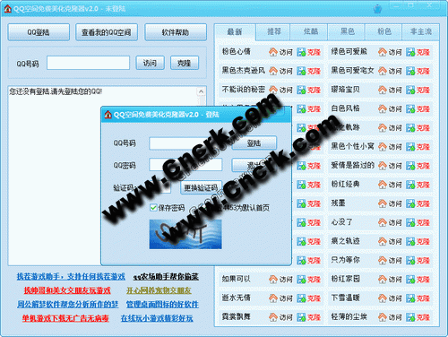 QQ空间免费美化克隆器 V3.0 简体中文绿色免费版 qq空间免费美化克隆器,可以瞬间将别人漂亮的qq空间装扮克隆到自己的空间!通过克隆空间让您的 qq空间变得更加绚丽!由我们开发的QQ空间美化克隆器可以快速准确免费的装备QQ空间,并且装扮不需要任何技术和困难, 软件只是傻瓜式操作即可! 软件特点: 1.登陆您的QQ空间 2.填写准备克隆的QQ空间号,然后一键克隆。 3.打开你的空间看看吧,就这么简单! 4.智能克隆模式,只需三步即可完成...软件初次运行会提示是否修改主页,请用户注意选择!