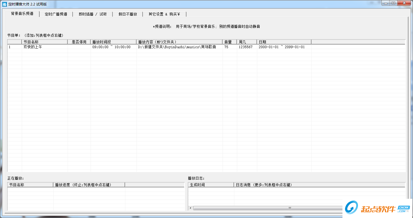 时方定时播音大师是一款专业的电脑定时播音软件。该软件带有超专业的播音效果和顶级的语音库,与淡淡的背景音乐相融合,定时开机播报,还可定时关机,为使用者提供一套简单又好用的商场播音系统。