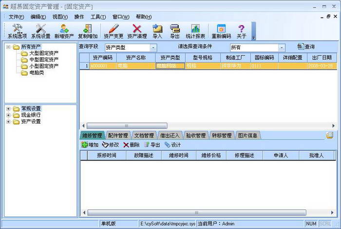 超易固定资产管理软件是绿色软件,无插件,免安装,下载后解压即可使用!超易固定资产管理软件是目前国内性价比最高的,最好的固定资产管理软件,相比同类型软件具有界面美观大方,功能强大而操作简单,自定义功能特别强大,是目前国内唯一一款提供超级强大自定义功能的固定资产管理软件。【软件特点】