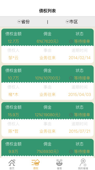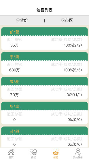 考虑到债权人缺少委托催客的经验,催催宝设置了地域筛选功能,筛选功能可帮助债权人迅速查找到与目标市级区域的催客,便捷的设置促成了债权人与催客的快速合作。如果债权人首次选择的催客未能完成任务,债权人与催客可在协商后可在APP上确认更换新的催客,人性化的设置在推动双方合作的同时也节约了双方的时间。