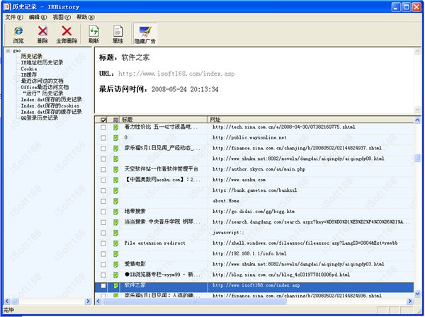 历史记录管理器 V4.0 简体中文绿色免费版 历史记录管理器用于查看和管理IE上网历史记录、缓存记录、cookie记录、地址栏历史记录、运行历史记录、最近访问过的文件、QQ历史记录,以及使用IE不能查看和管理的保存在index.dat文件中的历史记录等等。它不但可以方便直观的查看和管理本机与上网有关的所有历史记录,而且可以查看和管理用户对本机的所有文件操作记录,同时还可以有选择性的删除或全部删除历史记录。另外,还可以查看并彻底清除使用IE的清除历史记录不能清除的记录。最大限度保护你的隐私。也可以用于监控未成年人对电脑的使用