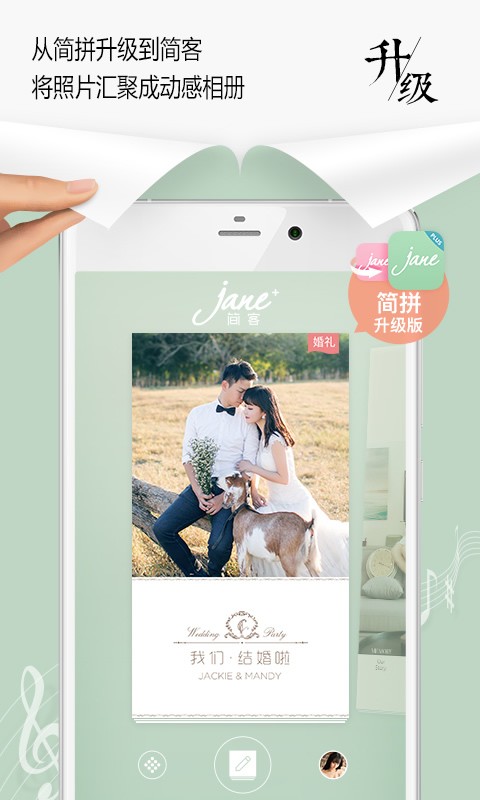 1.全新功能:从简拼到简客,从静态到动态,用音乐、照片、文字认认真真将一段特别时光编辑成小册子2.百套模板:这是我们设计从简拼中精选的最常用、最喜爱的100套模板,涵盖求职、旅行、情感、聚会、服饰、文艺……每一个认真的时刻,请记得用简客为自己加分